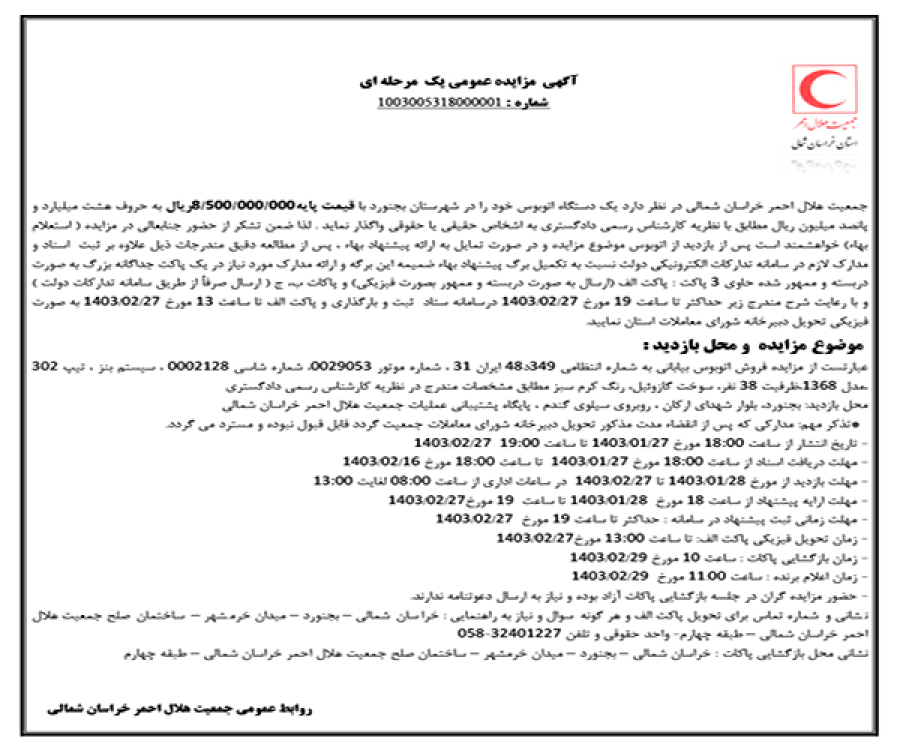 آگهی مزایده عمومي یک مرحله اي هلال احمر