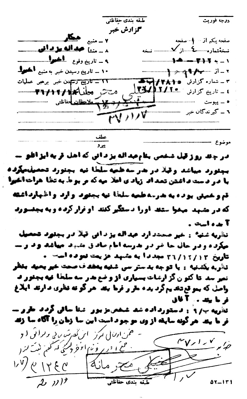 در چند روز قبل شخصی به نام عبدالله یزدانی که اهل قریه ایزانلو بجنورد می‌باشد و قبلاً در مدرسه علمیه سلطانیه بجنورد تحصیل می‌کرده، با در دست داشتن تعداد زیادی اعلامیه که مربوط به تظاهرات اخیر در قم و خمینی بوده، به مدرسه علمیه سلطانیه بجنورد وارد و اظهار داشته که در مشهد می‌خواستند او را دستگیر کنند، او فرار کرده و به بجنورد آمده است.1