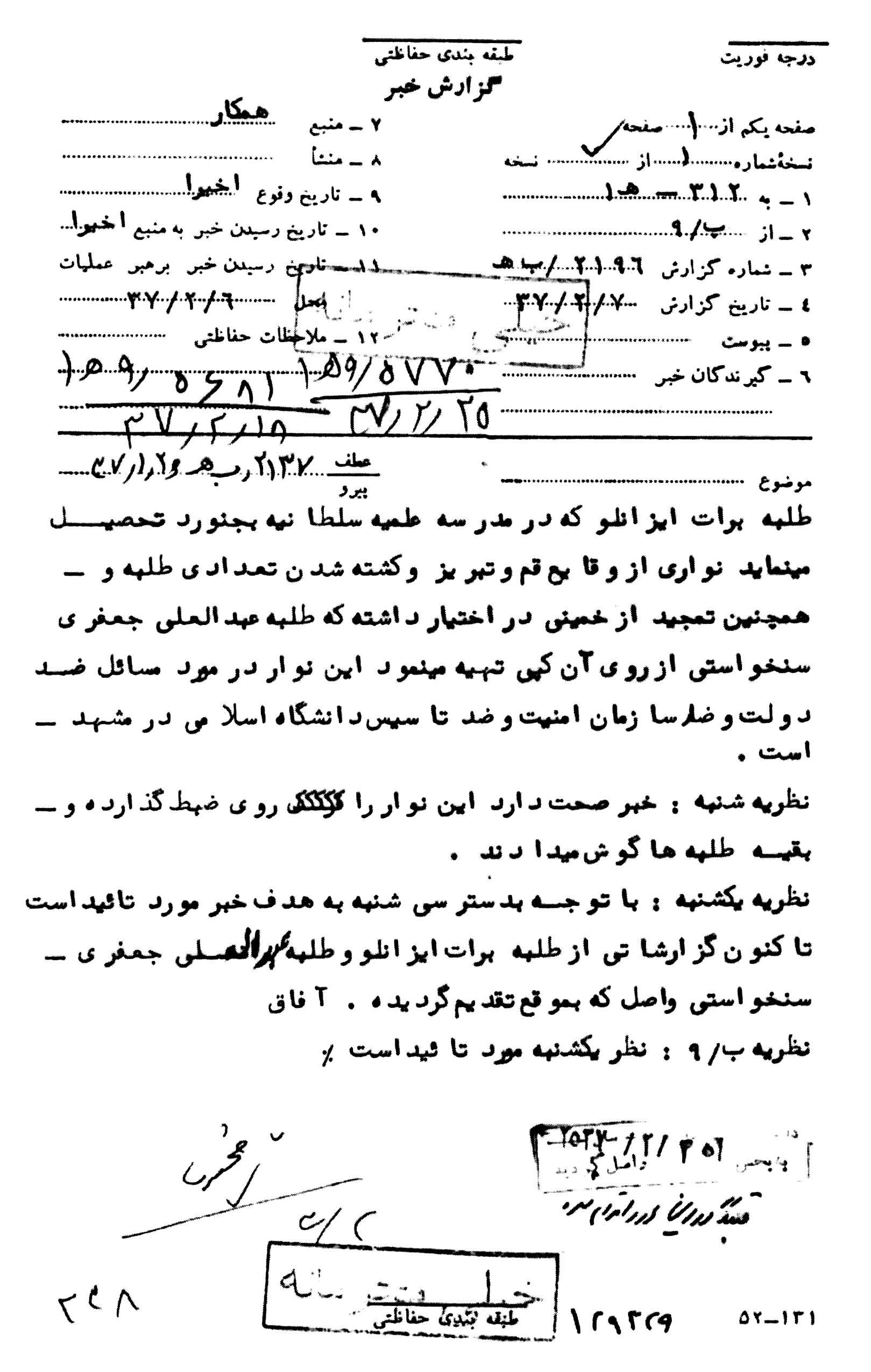 طلبه برات ایزانلو که در مدرسه علمیه سلطانیه بجنورد تحصیل می‌نماید، نواری از وقایع قم و تبریز و کشته‌شدن تعدادی طلبه و همچنین تمجید از خمینی در اختیار داشته که طلبه عبدالعلی جعفری سنخواستی از روی آن کپی تهیه می‌نمود. این نوار در مورد مسائل ضد دولت و ضد سازمان امنیت1 و ضد تأسیس دانشگاه اسلامی2 در مشهد است.