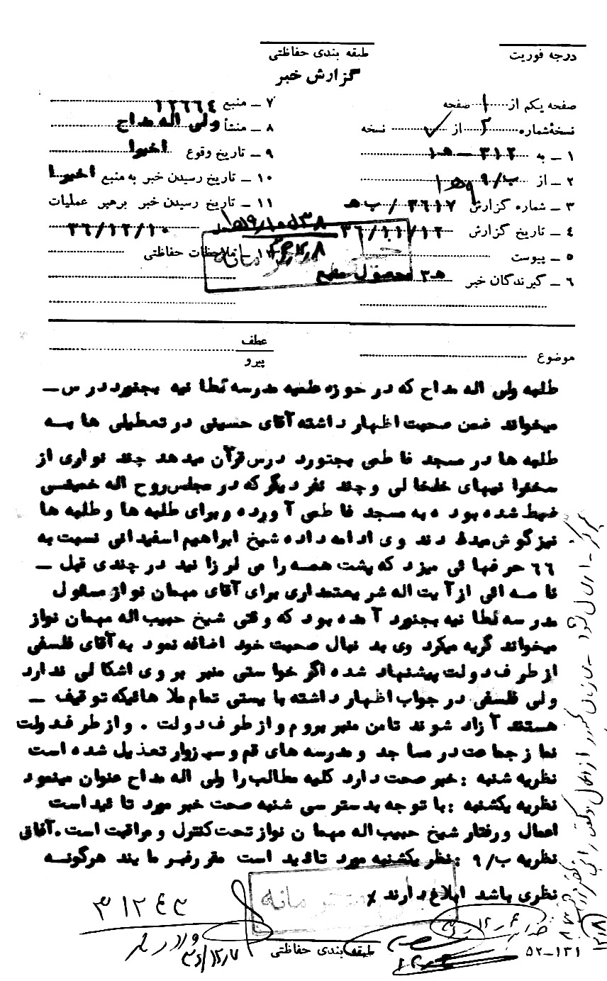 طلبه، ولی‌الله مداح که در حوزه علمیه مدرسه سلطانیه بجنورد1 درس می‌خواند، ضمن صحبت اظهار داشته آقای حسینی در تعطیلی‌ها به طلبه‌ها در مسجد فاطمی بجنورد درس قرآن می‌دهد، چند نواری از سخنرانی‌های خلخالی2 و چند نفر دیگر که در مجلس[فرزند]روح الله خمینی ضبط شده بوده، به مسجد فاطمی آورده برای طلبه‌ها و طلبه‌ها نیز گوش می‌دادند. وی ادامه داده شیخ ابراهیم اسفیدانی نسبت به 66 حرفهائی می‌زد که پشت همه را می‌لرزانید. در چندی قبل نامه‌ای از آیت‌الله شریعتمداری برای آقای مهمان‌نواز مسئول مدرسه سلطانیه بجنورد آمده بود که وقتی شیخ حبیب‌الله مهمان‌نواز می‌خواند، گریه می‌کرد. وی به دنبال صحبت خود اضافه نمود به آقای فلسفی از طرف دولت پیشنهاد شده اگر خواستی منبر بروی اشکالی ندارد، ولی فلسفی در جواب اظهار داشته بایستی تمام ملاهائی که توقیف هستند آزاد شوند تا من منبر بروم و از طرف دولت نماز جماعت در مساجد و مدرسه‌های قم و سبزوار تعطیل شده است.