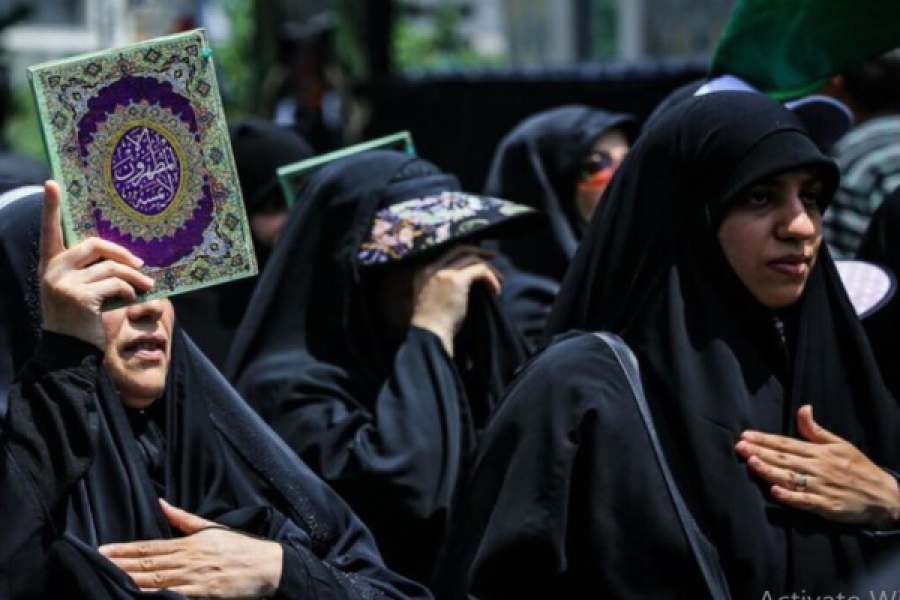 زنانی با چادرهای مشکی در حسینیه جاجرمیها در ردیفهای جداگانه نشستهاند و با چشمهای گریان به صحنه تعزیه مینگرند.